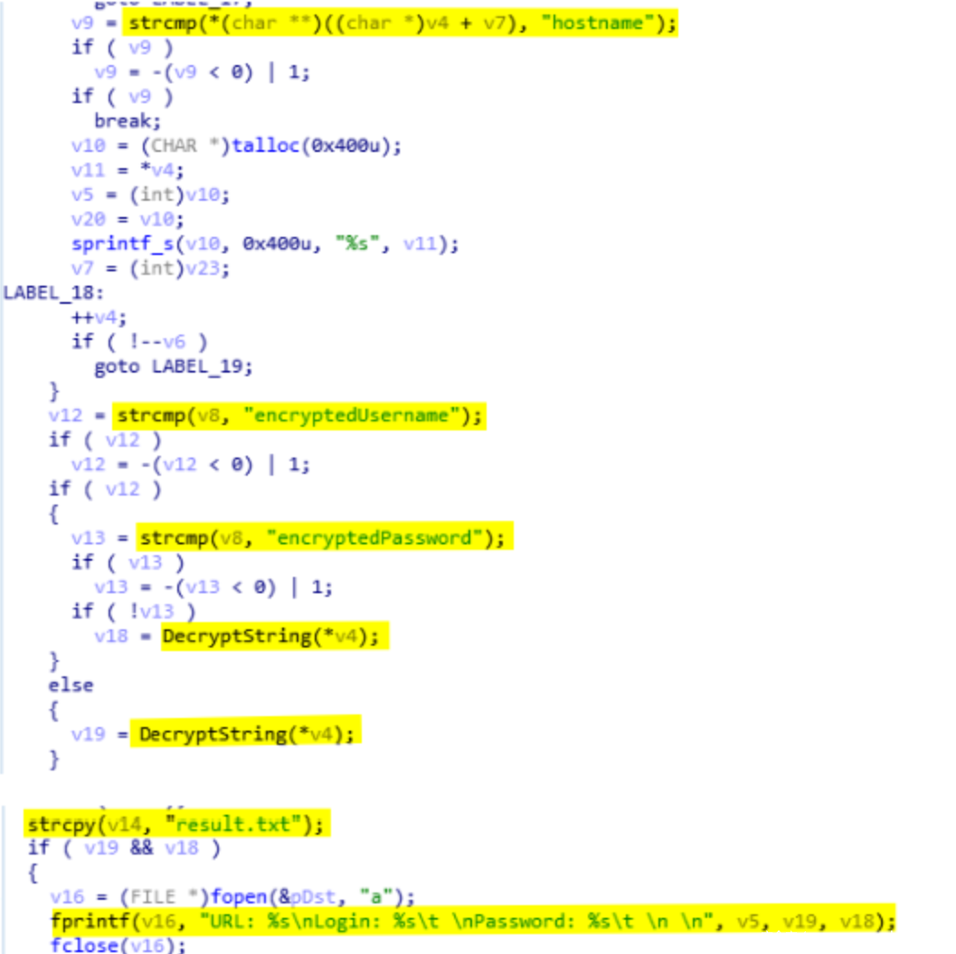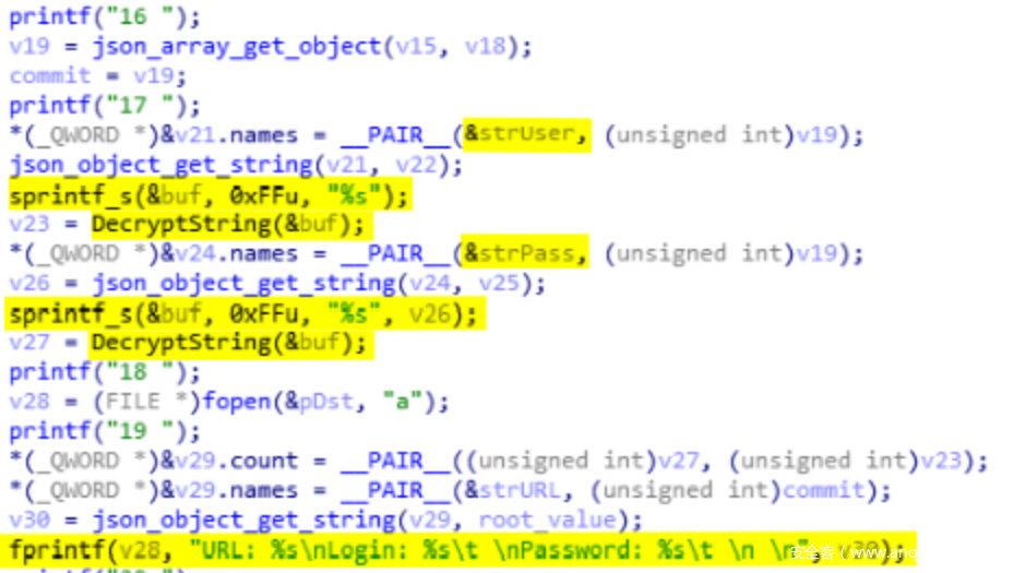 为了获取凭证,恶意软件会查找ogins.json和signons.sqlite这两个文件。这个json文件由browser-dumpwd项目中parson.c里的by decrypt_firefox_json (0x403930)函数进行解析。从json中检索的值为hostname, encryptedUsername和encryptedPassword。 用户名和密码用nss3.dll中的DecryptedString (0x403430)函数进行解密。