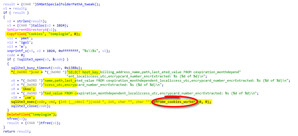 函数dump_chromesql_cookies(0x403300)将创建 名为 templogim(sic)的SQLite Cookies副本。然后发出以下SQL请求: SELECT host_key,name,path,last_access_utc,encrypted_value FROM cookies; 。这个SQL查询使用回调chrome_cookies_worker(0x401E00,如下图)