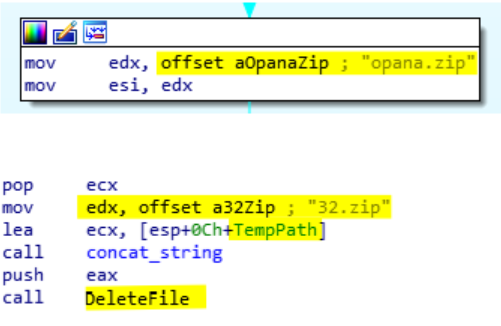 在本节,我们将说明2018年8月21日编译的样本的更新情况。这个可执行文件(3d28392d2dc1292a95b6d8f394c982844a9da0cdd84101039cf6ca3cf9874c1)并在VirusTotal上可用。这次更新对代码进行了调整,一些bug被修复(比如由于宽字节导致门罗币路径错误)32.zip(从C2下载Mozilla DLL)被重命名为opana.zip,但是,作者忘记在删除代码中更改文件名(如下图)