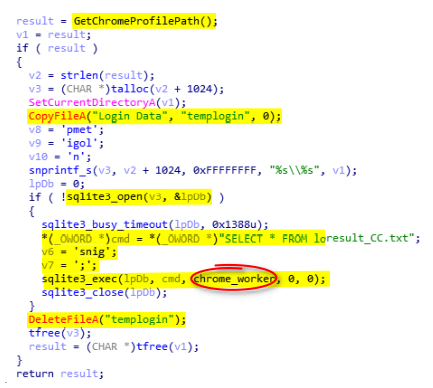 创建完头之后,恶意软件调用dump_chromesql_pass (0x401BC0)来dump所有凭据。它将SQLite数据库登录数据的副本复制到之前选择的用户数据目录中的templogin中,以避免锁定数据库。然后,它打开数据库并使用SQLite进行请求(代码如下图)。