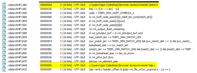 在分析中,一些特殊的字符串让我们找到了凭证如何被窃取并加密的原因。在下图中,我们可以看到恶意软件作者使用了一个名为browser-dumpwd-master的项目。Google这个目录名字,我们找到了放在GitHub上的POC(https://github.com/wekillpeople/browser-dumpwd),里面介绍了如何窃取Chrome和Firefox的证书。然而,这个项目中并没有miniz.h或zip.c,我们将在后面看到它们从何而来。不出所料,作者借鉴了POC代码,来实现Chrome / Firefox凭证的窃取。