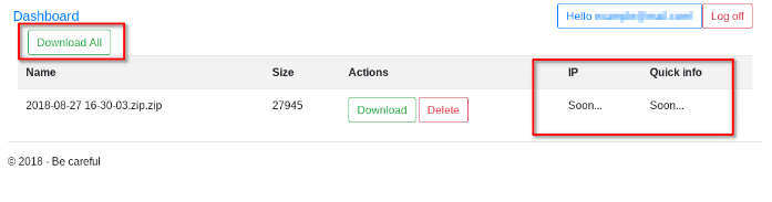 在2018年8月26日,面板中添加了两个新字段,IP和快速信息 (尚未工作)。还有一个新按钮可以在仪表板中下载所有ZIP(如下图)。
