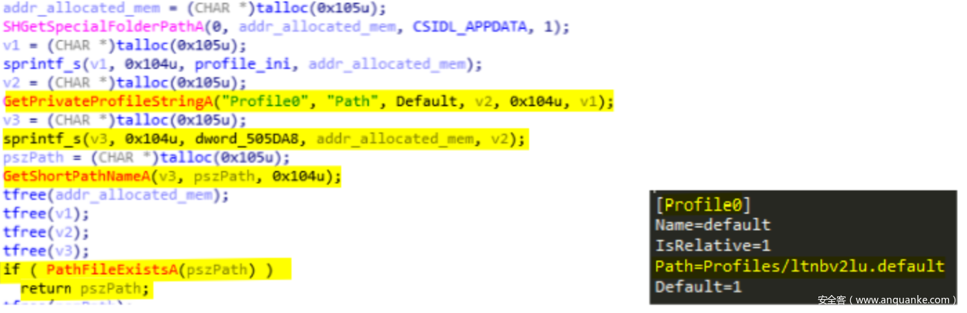 加载函数后,AcridRain将检索Profile0的路径。为此,它会读取%APPDATA%中相应浏览器的profile.ini,并提取与Profile0关联的文件夹的路径(如下图)。这是由GetFirefoxProfilePath(0x403500)函数完成的。