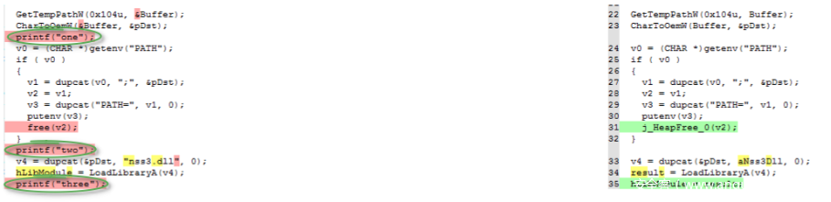 在本节中,我们将说明在为期16天的开发过程中所做的更新。文中使用的可执行文件(769df72c4c32e94190403d626bd9e46ce0183d3213ecdf42c2725db9c1ae960b)于2018年7月19日编译,并在Hybird-Analysis给出分析报告。为了找到两个版本之间的区别,我们使用YaDiff在IDA数据库和Diaphora之间传播标志来比较两个IDB。我们看到的第一个修改是删除调试日志,如下图: