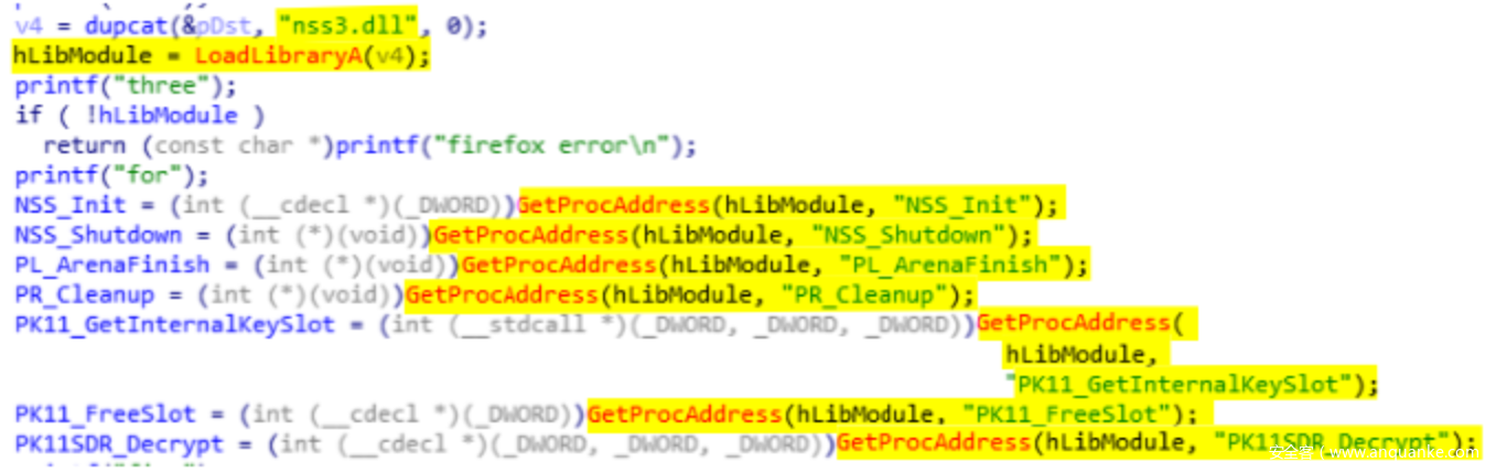 首先dump_firefox_passwords (0x403E60)函数会从nss3.dll下载所需的函数。这些函数为NSS_Init, NSS_Shutdown, PL_ArenaFinish, PR_Cleanup, PK11_GetInternalKeySlot, PK11_FreeSlot, and PK11SDR_Decrypt(如下图)