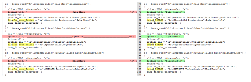 AcridRain窃取的Firefox凭证和Chrome凭证一样,都保存在result.txt中。正如预期的那样,过程是一样的。首先将头写入与目标浏览器相关联的报表文件。然后窃取凭证(如下图)。目标浏览器包括Firefox,Waterfox,Pale Moon,Cyberfox,Black Hawk和K-Meleon。