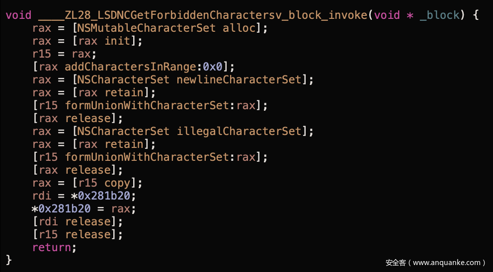 查找导入的库,我们发现Finder似乎引用了LaunchServices,快速搜索感兴趣的符号后,我们找到了_ZL28_LSDNCGetForbiddenCharacterssv。查看该函数,我们又找到了部分代码,更加确定该库可能用来负责文件名过滤: