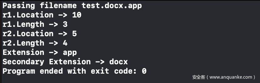 了解到这些信息后,我们可以做一些测试,观察文件名的解析方式。下面我们可以创建名为test.docx.app的一个目录,查看每个变量值: