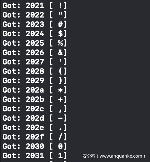 需要注意的是,该方法似乎会重点关注前面引用的字符集范围,包括空格符、换行符或者Unicode规范中标识为“非法”的字符,然而我们还是有办法能绕过这种限制。比如,我们可以使用“Ideographic Space”(表意空间)中类似UTF-8的字符码,将字符分别转化为0xe1 0x85 0xa0,这样就能绕过该方法的限制: