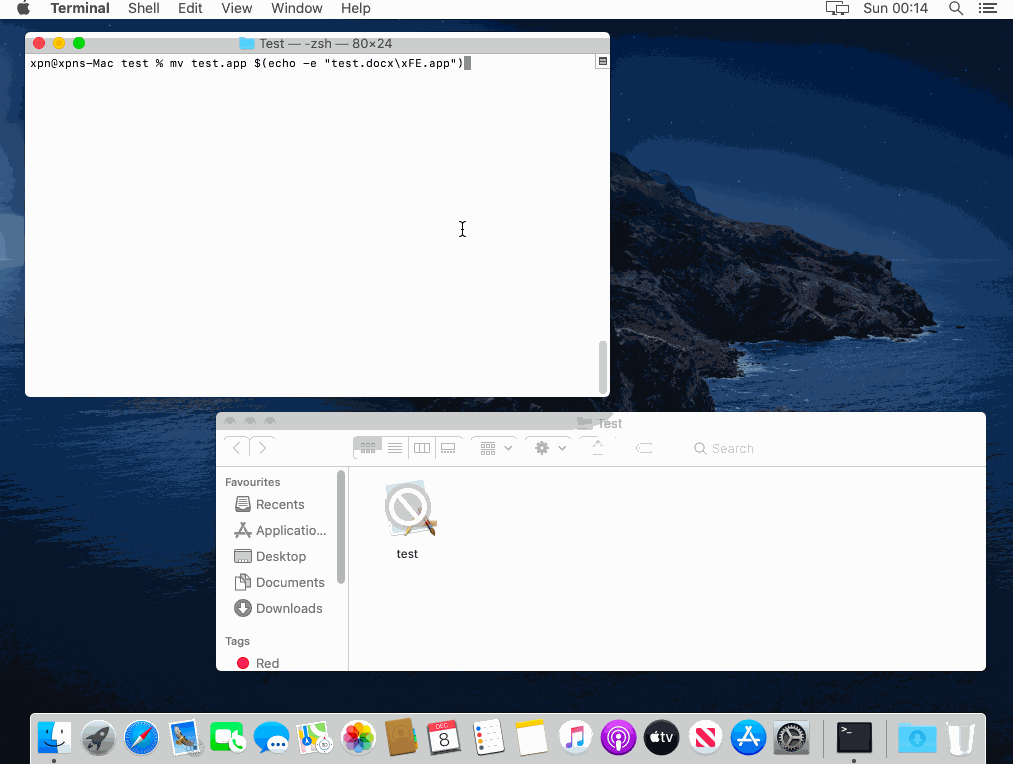在继续操作之前,需要提一下此次研究过程中我在Finder中找到的一个bug。如果我们尝试通过某种方式命名文件(如test.docx\x20\x80.app),那么每当查看该文件时,Finder都会出现崩溃。实际上,由于系统没有正确处理UTF-8编码,大于0x80的任何值都会导致Finder崩溃: