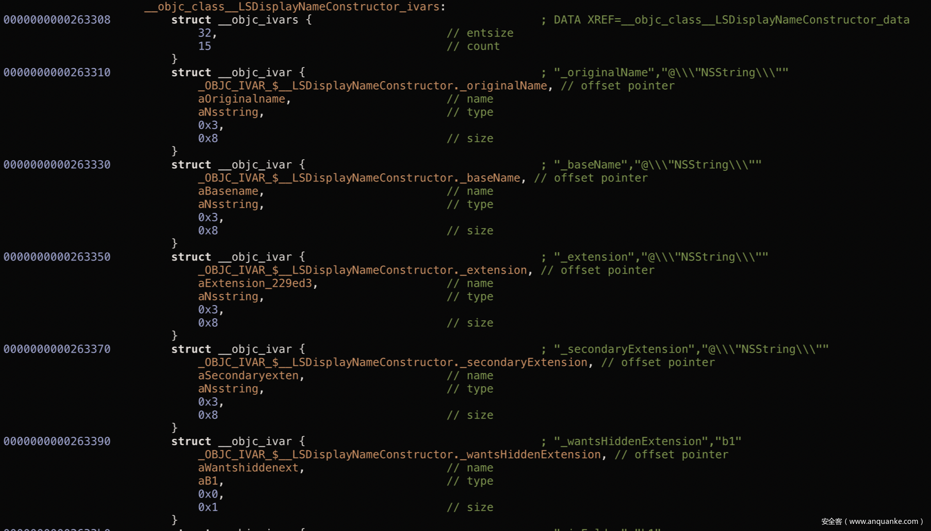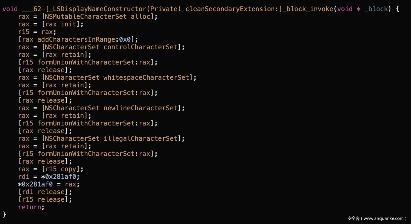 但为什么执行流会进入该分支?查看交叉引用信息后,我们找到了一个类:LSDisplayNameConstructor,其中包含一些比较有趣的方法名,比如cleanSecondaryExtension、replaceForbiddenCharacters以及wantsHiddenExtension。