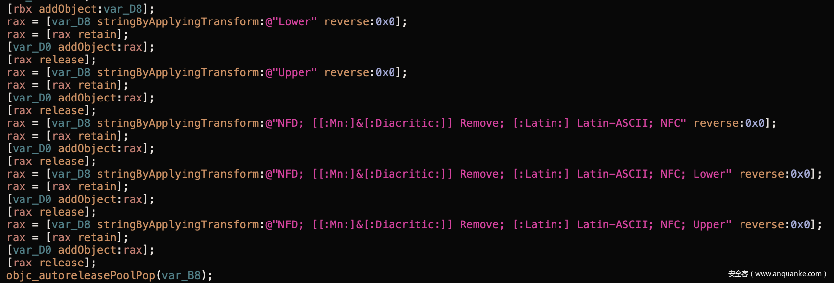 [extensionSet addObject:[extension stringByApplyingTransform:@"NFD; [[:Mn:]&[:Diacritic:]] Remove; [:Latin:] Latin-ASCII; NFC; Upper" reverse:false]];