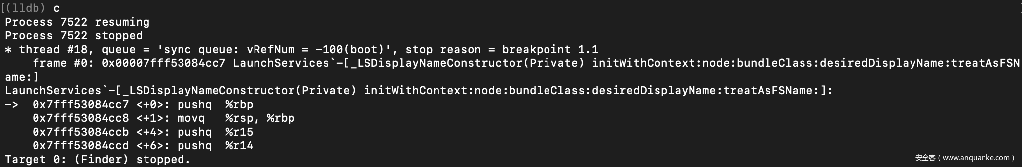 我们首先来关注-[_LSDisplayNameConstructor initWithContext:node:bundleClass:desiredDisplayName:treatAsFSName:]方法,该方法用来初始化LSDisplayNameConstructor对象。下面使用lldb来添加一个断点: