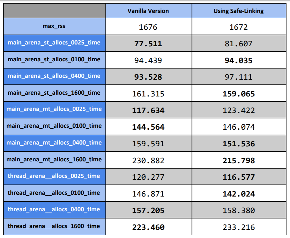 我们测试了补丁程序,以将建议的缓解措施成功集成到最新版本的glibc(ptmalloc),uClibc-NG(dlmalloc),gperftools(tcmalloc)和更高版本的Google全新TCMalloc。此外,我们还指出了Chromium的开发团队使用我们提交给gperftools的版本的“Safe-Linking”,希望我们针对gperftools的性能提升能够在Chromium版本中发挥作用。