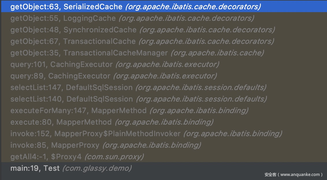 在该函数上打上断点,启用mybatis的内置二次缓存功能,看一下堆栈,
