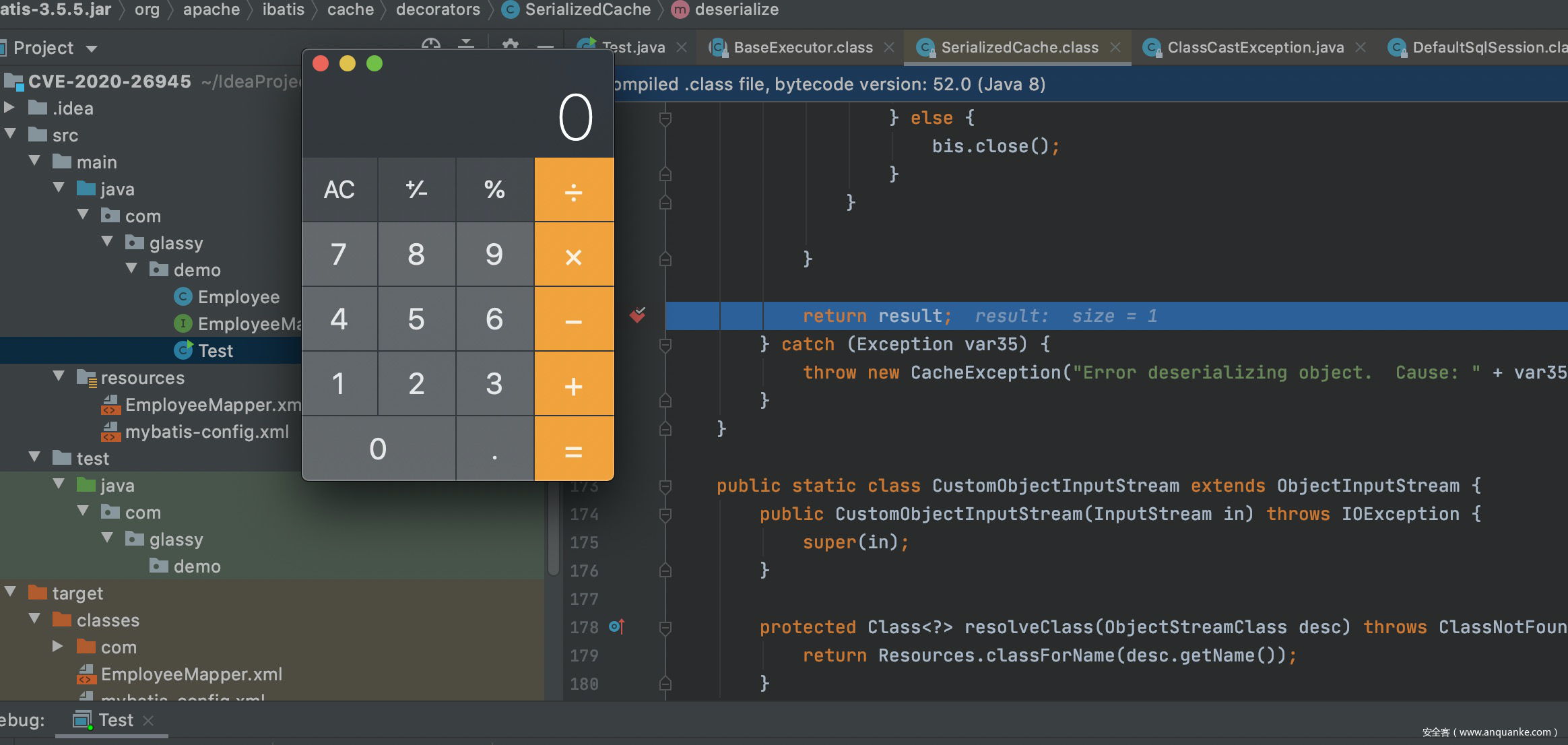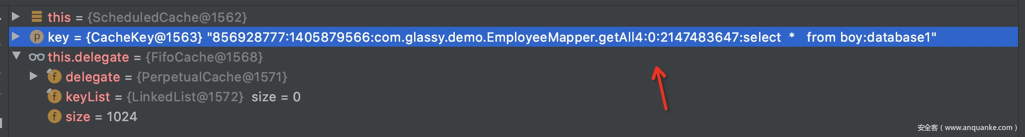 可以看到object的值 其实就是PerpetualCache.cache对应的value,这也应正了官方通告里的一条利用的关键要求:the attacker found a way to modify entries of the private Map field i.e. org.apache.ibatis.cache.impl.PerpetualCache.cache and a valid cache key