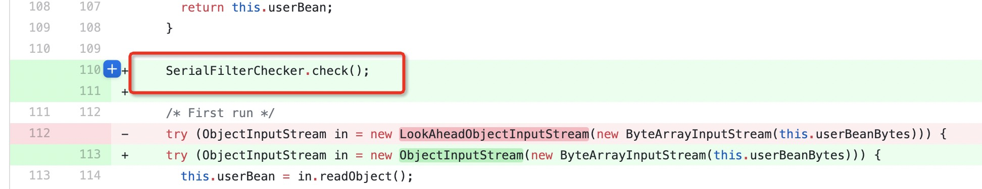 首先看了一下官方补丁的防护方式,增加了一个反序列化过滤函数,那过滤一定发送在漏洞触发的正前方,