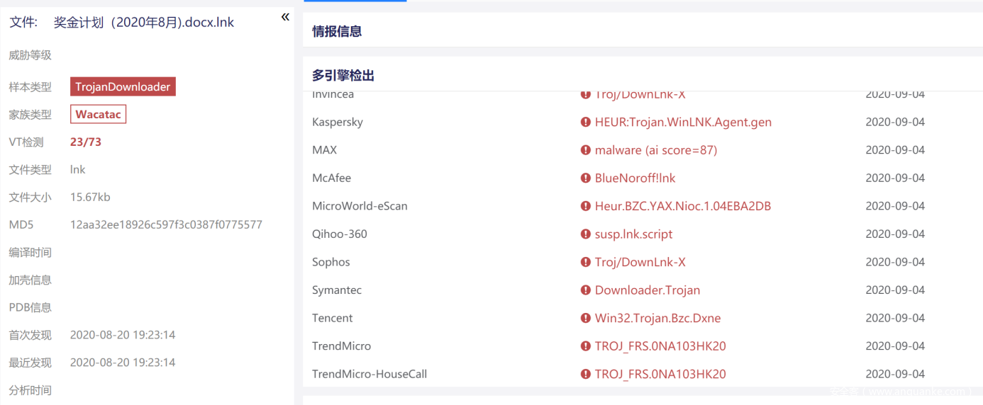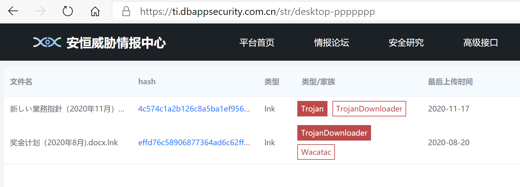 “新しい業務指針(2020年11月).docx.lnk”样本中出现用户名字符串“desktop-ppppppp”,我们关联到样本“奖金计划(2020年8月).docx.lnk”(md5:12aa32ee18926c597f3c0387f0775577)