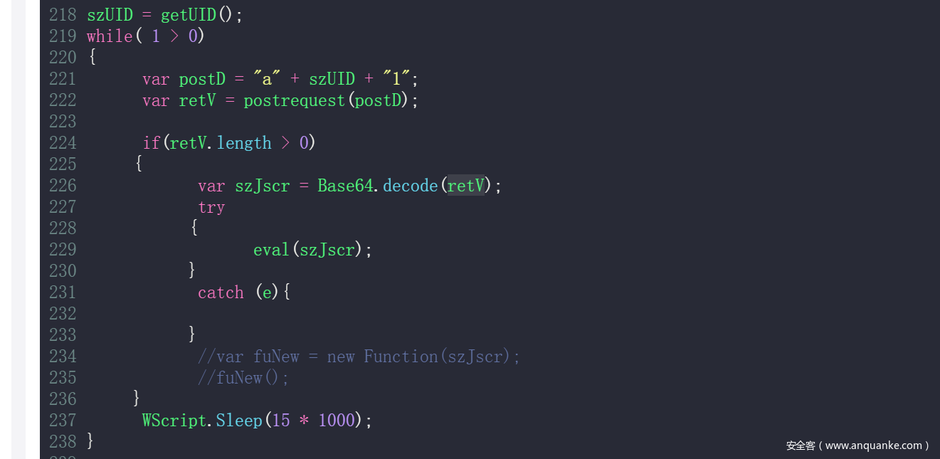 生成用于标识受害机的ID,发送至C2服务器后每15秒检查一次C2服务器发送的后续payload。