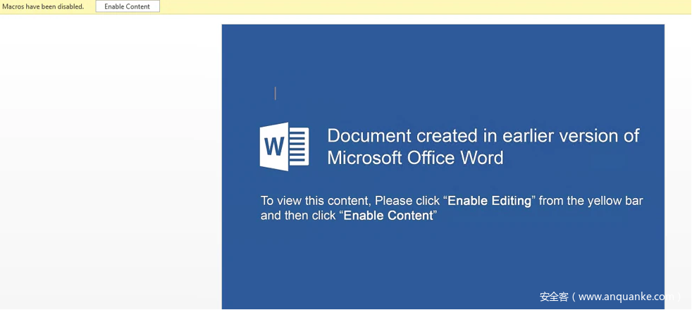 早期使用的文件大多为钓鱼文档,内容选取上也以诱导受害者启用宏为目标,受害者启用宏后通过执行恶意的vbs脚本下载后续后门木马。