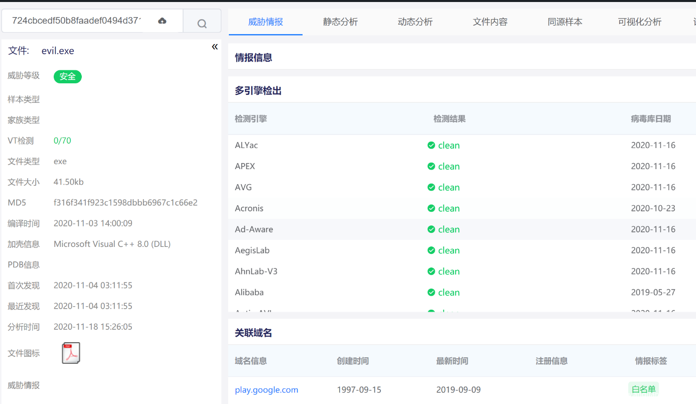 文件有着很好的免杀效果,图标伪装成PDF。创建时间与提交时间间隔较短,加之文件提交时的命名方式,推测该样本为测试样本。