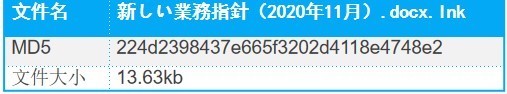 如分析的文件为最新捕获到的lnk文件,文件名为“新しい業務指針(2020年11月).docx.lnk”,意为新业务准则(2020年11月)。