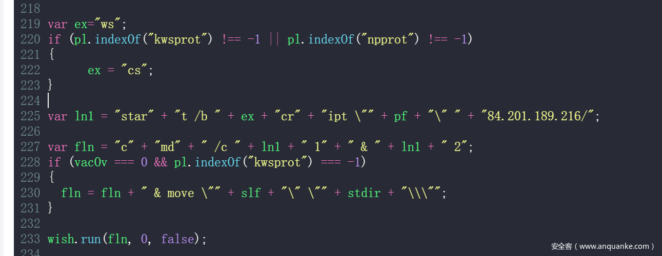 检测“kwsprot”进程(金山毒霸)与“npprot”进程(NPAV),若存在使用cscript执行后续的脚本,否则使用wscript。这一过程与此前Lazarus对加密货币行业攻击中所使用的脚本一致。