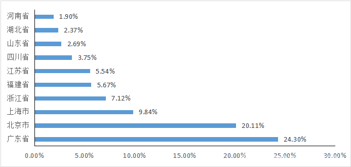 全国3307221款App中,有770647款可以根据明确的开发、运营主体进行归属地划分,下列区域分布仅基于这770647款做分析。从区域来看,广东省App产量位居第一,占全国App总量的24.30%;其次是北京市,占总量的20.11%;上海市位列第三,占总量的9.84%。以下是全国移动互联网应用地域分布top10: