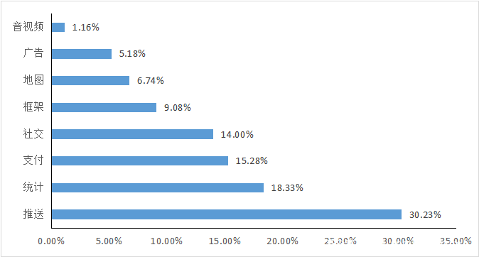 截止到2020年12月31日,从应用嵌入第三方SDK的类型来看,嵌入了推送类SDK的App数量最多,占比为30.23%,其次是统计类SDK,占比为18.33%;位列第三的是支付类SDK,占比为15.28%。详情如下:
