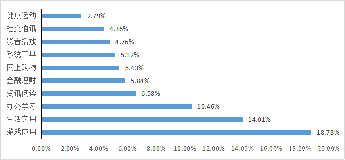 从行业分类来看,游戏类App应用数量占全国总量的23.79%,位居第一;工具软件类应用数量占全国总量的18.99%,位居第二;金融类应用数量占全国总量的14.97%,位居第三。