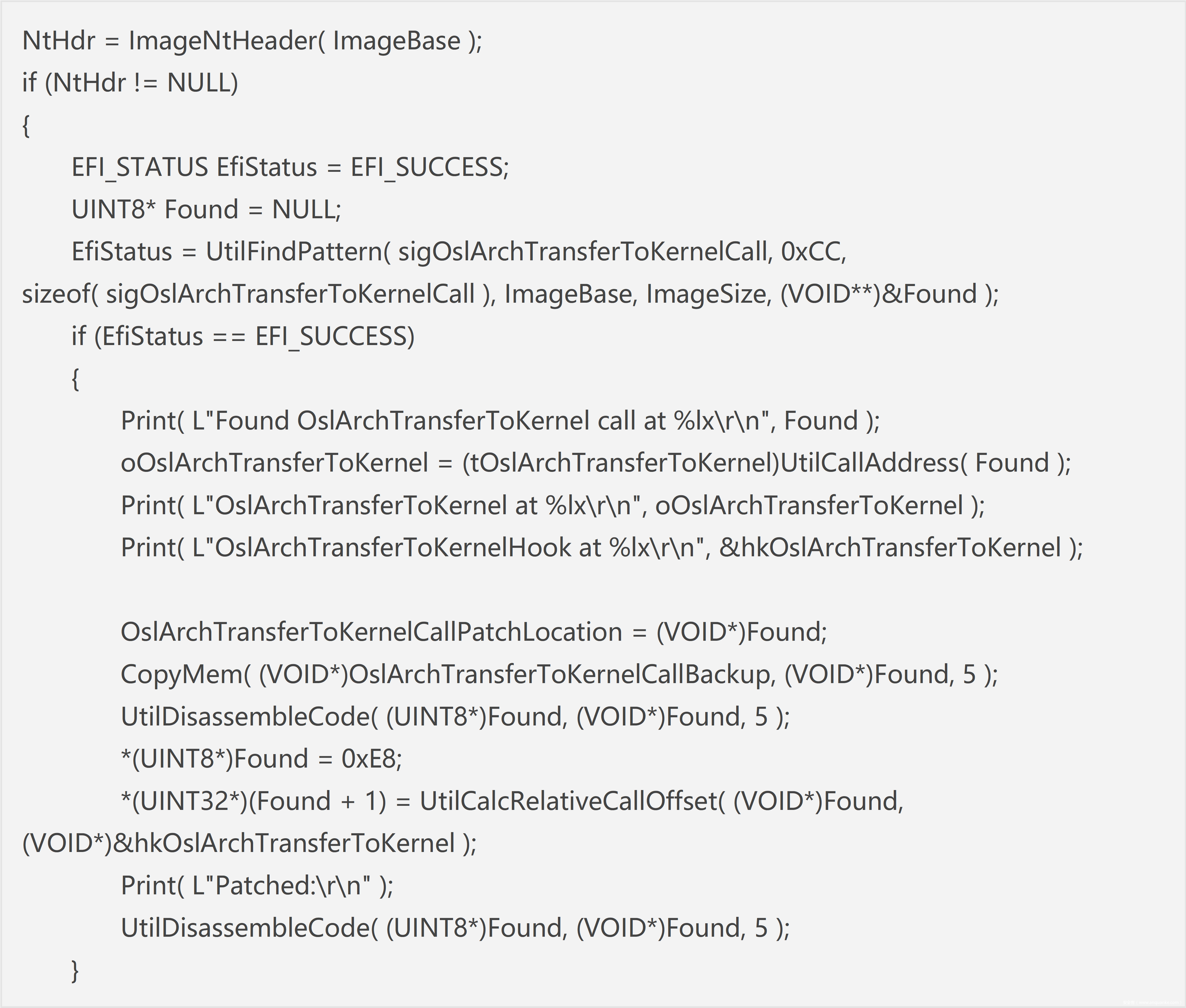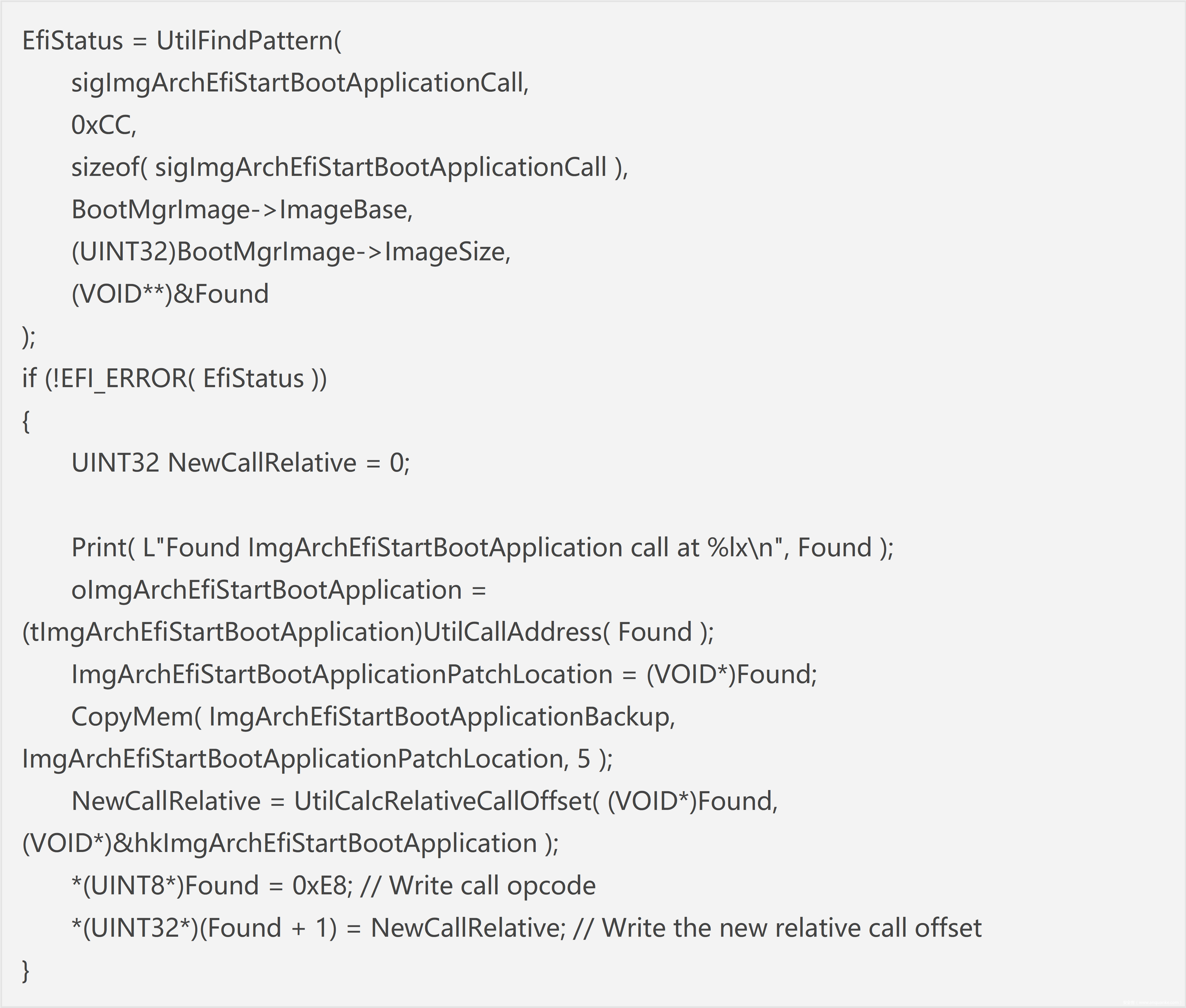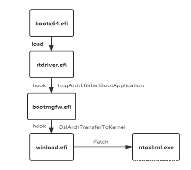 该函数对 bootmgfw.efi 的 ImgArchEfiStartBootApplication函数进行 hook 从而获得控制权,然后在自己的 hook 函数中又对 winload.efi 的 OslArchTransferToKernel 进行 hook,从而使得在加载 OS 内核镜像(ntoskrnl.exe)的时候 patch 掉 Windows 的 PatchGuard 代码,实现任意 rootkit 行为,代码如下: