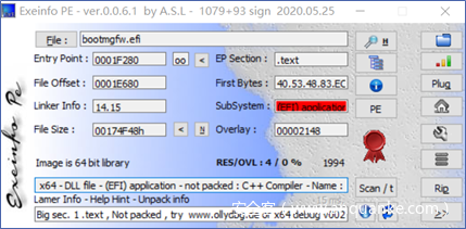 对于 UEFI 开发来说,其程序一般分为两大类,一种是 UEFI 应用程序,一种是 UEFI 驱动程序,其后缀名都是 .efi 格式。但其实这并不是一种新的文件格式,而是符合 PE/COFF 规范的 PE 文件,更准确的说无论是 UEFI 应用程序还是 UEFI 驱动程序都是符合 E/COFF 的 dll 文件。EFI 文件的识别可以通过 Exeinfo PE 进行查看,如下图: