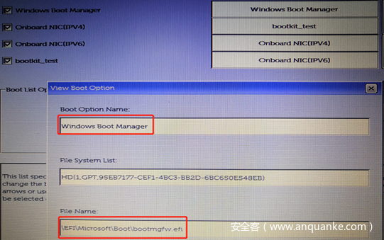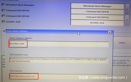 以下是笔者的 UEFI 启动设置,Windows Boot Manager 为 UEFI 系统默认,bootkit_test 是笔者手动添加的基于磁盘引导的启动方式。