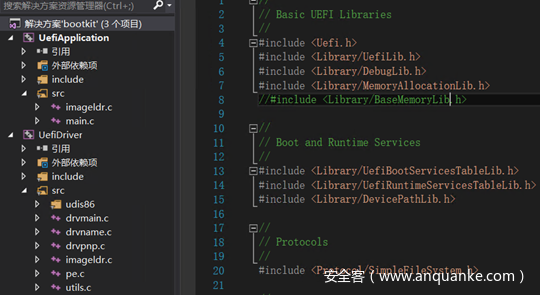 该工程文件分为两部分,UEFIApplication 为 loader 程序(编译后重命名为 bootx64.efi),UefiDriver 为真正实现内核感染的文件(编译后重命名为 rtdriver.efi)
