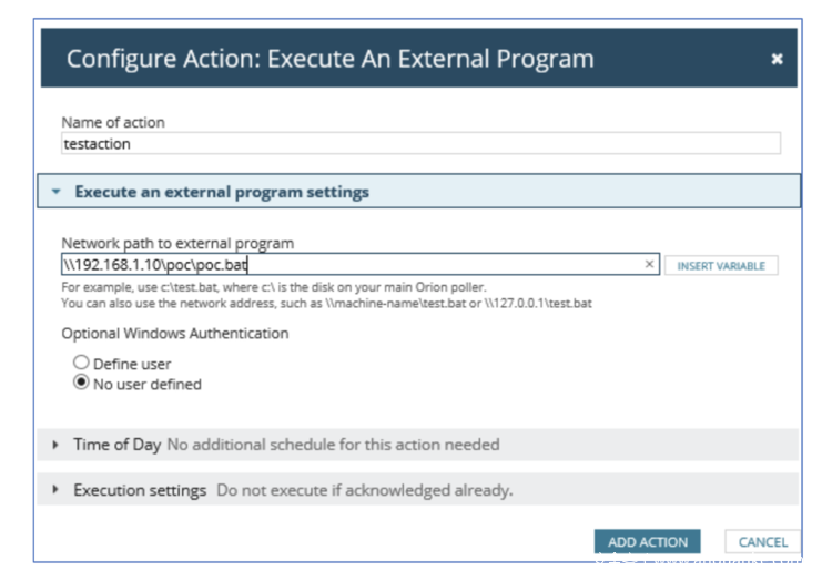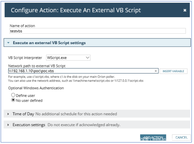该产品允许非管理员用户指定触发告警时要执行的VBS脚本的路径。与此同时,该路径没有对远程SMB共享上托管的VBS文件加以任何的限制。这样一来,就使得攻击者可以指定要执行的任意VBS脚本。