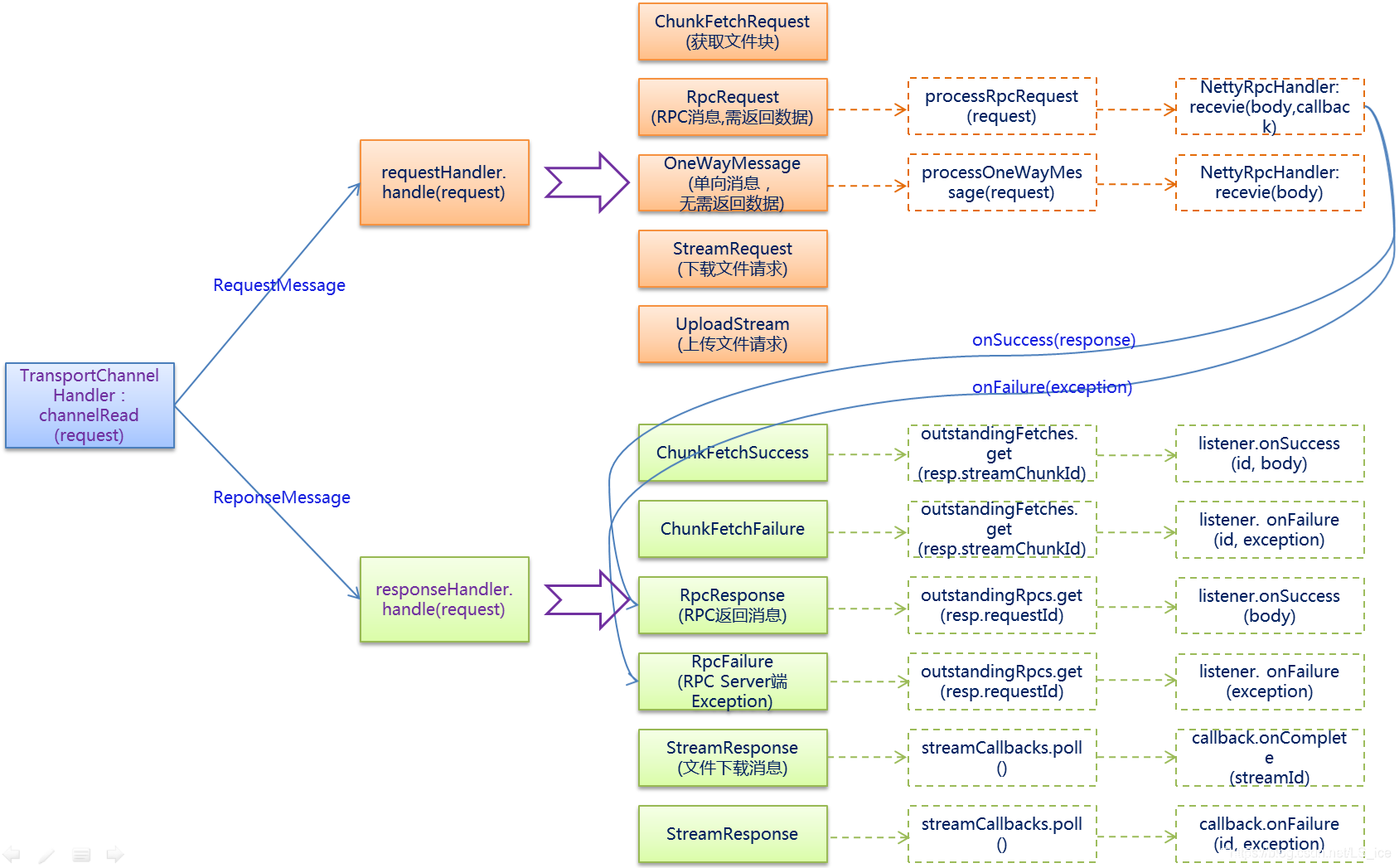 回溯代码执行流及SPARK RPC的实现, TransportRequestHandler 调用了 RPC handler receive 函数和 receiveStream,