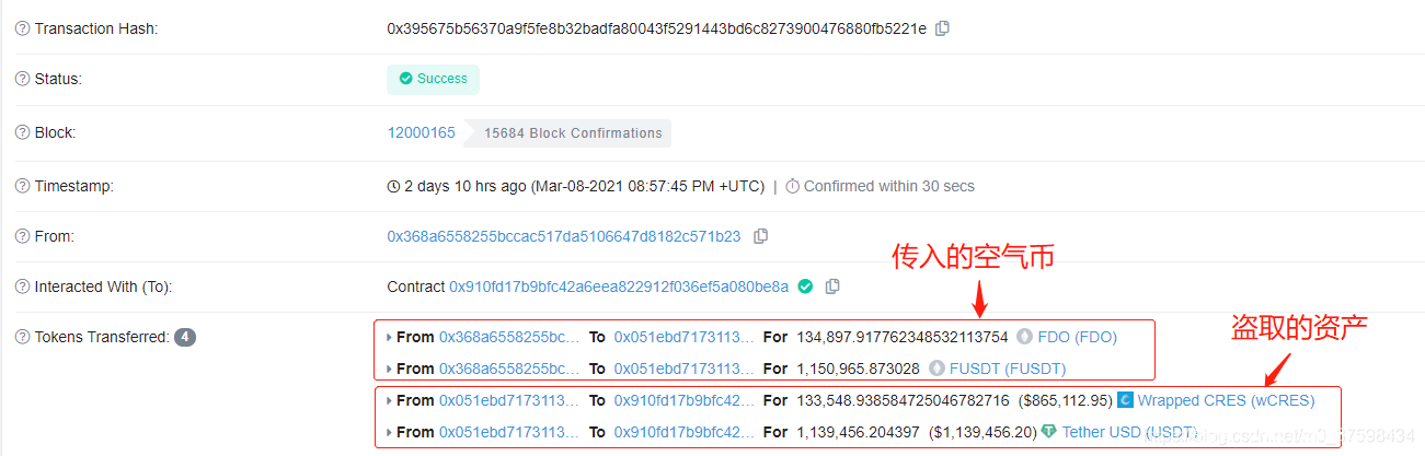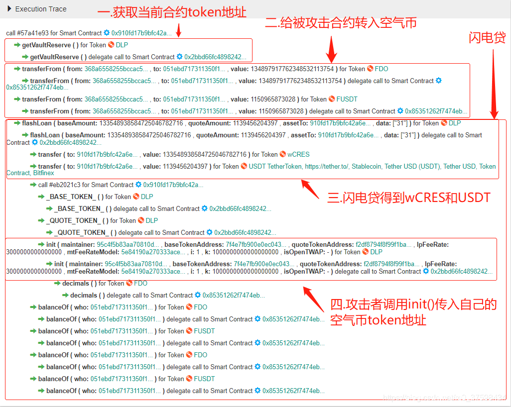 由于在之前的操作中,攻击者将这两种空气币(13万FDO和115万FUSDT)转入被攻击合约,之后进行闪电贷获取了贷款(13万枚wCRES和113万枚USDT),在闪电贷的操作中又重新调用被攻击合约的init()函数,并在之前合约token地址(wCRES和USDT )处,传入两种空气币(FDO和FUSDT)的token地址,这里就是问题所在。