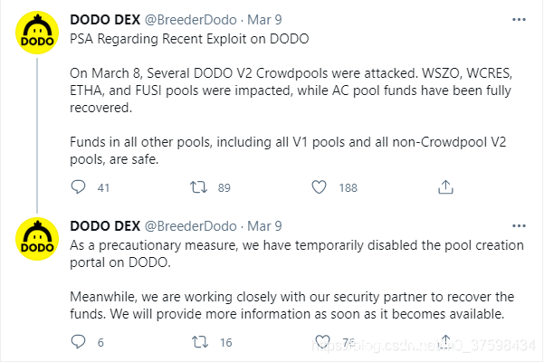 零时科技区块链安全情报平台监控到消息,北京时间2021年3月9日,DODO官方发推称DODO V2资金池wCRES/USDT遭到黑客攻击,已暂时禁用DODO上的资金池创建,并表示其他资金池都是安全的。