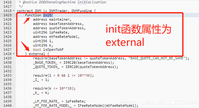 上图中可以看到DVM合约中,存在init()函数对池子进行初始化设置操作,但该函数并不是只调用一次,也不是只有内部调用的internal属性,而是external属性,就是说可以进行外部调用。那么攻击者可以调用该函数就不奇怪了。