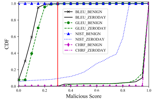 相似性度量:使用BLEU作为相似性度量,并演示了如何凭经验确定异常检测阈值。下图绘制了CDF,用于分配良性请求和0-day攻击的恶意分数,其中X轴表示恶意分数的值,Y轴表示累积分布。在BLEU BENIGN和BLEU ZERODAY曲线之间可以发现明显的差异:超过90%的良性请求的恶意分数小于0.3,而BLEU ZERODAY的恶意分数大多分布在0.95以上,这可以通过BLEU ZERODAY的CDF急剧增加0.95来证明。设置阈值的一种经验方法是自动扫描阈值并找到具有最大除法能力的阈值(例如,下图中的红色垂直线)。