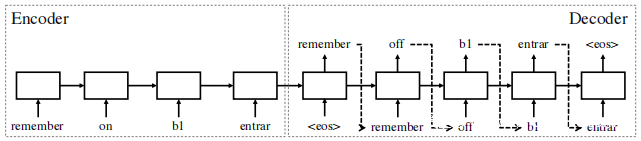 编码器-解码器网络的核心功能是将一个序列映射到另一个序列。在本文中,使用从上述步骤获得的令牌序列(称为原始令牌序列)作为输入。输出(称为恢复令牌序列)是编码器-解码器网络在学习数据后重建的序列。上图示出了一个示例中描述的编码-解码网络的典型结构。给定一个输入序列“ remember on b1 entrar EOF”,网络将输出另一个序列“ remember off b1 entrar EOF”。请注意,这些序列只是示例,结果在野可能有所不同,两个序列的长度可能不同是相同的。