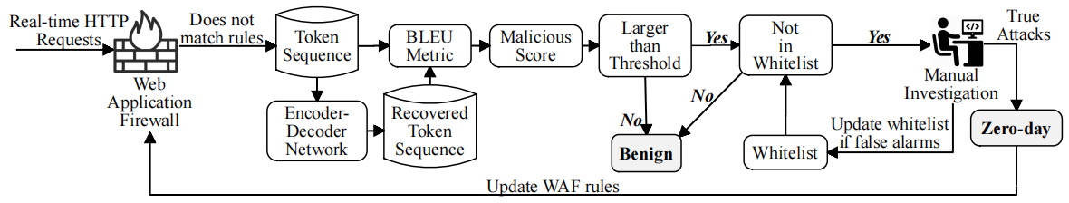 通过将0-day Web攻击检测问题映射到机器翻译质量评估问题,ZeroWall可以有效地检测0-day Web攻击。在ZeroWall中,现有WAF允许的历史Web请求(其中绝大多数是良性的)用于训练编码-解码递归神经网络,该网络捕获良性请求的语法和语义模式。网络将良性输入Web请求“转换”为潜在表示(由编码器),然后将表示“转换”为输出Web请求(由解码器),该输出Web请求与原始请求接近。在实时检测中,自动翻译器无法很好地理解0-day攻击请求(WAF无法检测到该请求),无法将其转换回其原始请求,因此被视为攻击。
