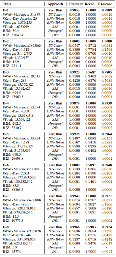 从一家顶级全球互联网公司I运营的WAF W获得了真实记录,该公司为数百家企业客户提供基于签名的WAF服务.2019年6月的第一周,收集了8个7天的记录。每个跟踪(用D-n表示)收集了特定企业客户的全部请求集,其不同的统计信息显示在上表的第一列中。此外,跟踪中的请求类型(不同服务的API)超过8、000,并且参数的数量和类型有所不同。因此,总体而言,这些记录提供了很好的多样性,可以评估ZeroWall在不同客户之间的稳健性。