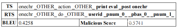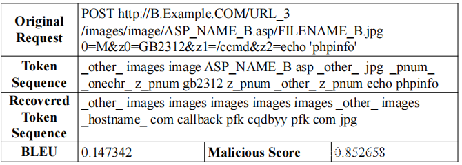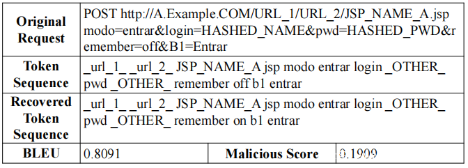 前表中给出的示例显示了编码-解码网络的不同输出。在给定一些输入的情况下,恢复令牌序列与输入的令牌序列相似,而有时恢复的序列与原始的令牌序列有很大不同。为了获得序列映射的质量,在这里使用BLEU度量。简单来说,BLEU度量的范围是0到1,值越高表明源序列和目标序列之间的相似度越高。为了检测目的,将恶意得分1-BLEU定义为估计量。较大的恶意分数意味着编码器/解码器网络无法重构给定的序列,表明输入序列可能是恶意的。如上图所示,恶意得分将用于与某个阈值进行比较,以判断请求是否为恶意的或对进一步操作有益。