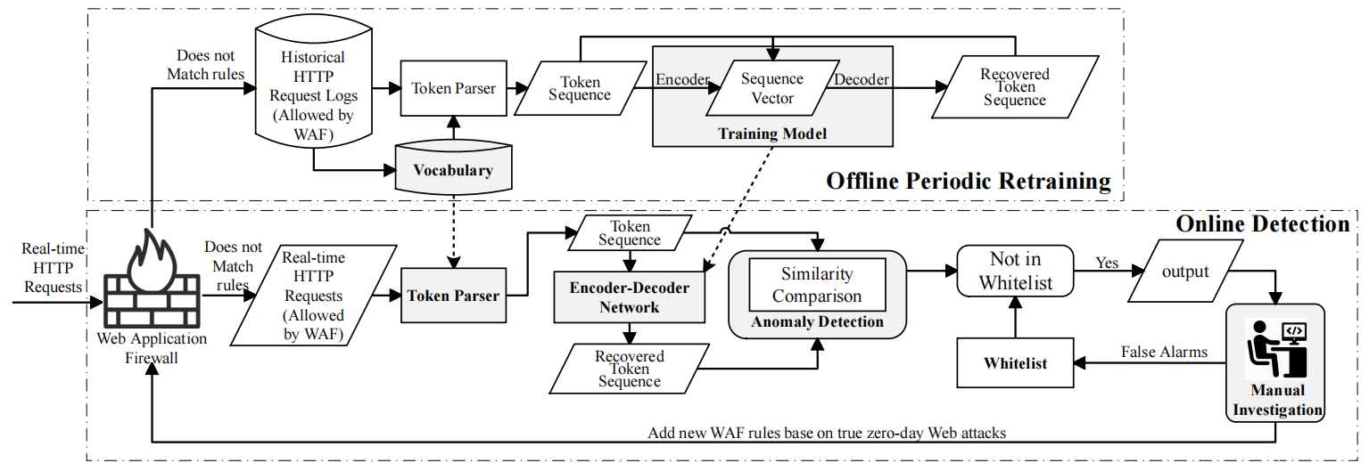 为了防御Web攻击,已提出各种基于机器学习防御措施,但是大多数这些方法不能有效地检测0-day Web攻击。0-day Web攻击由于以下原因而特别难以检测:首先,由于以前从未出现过0-day Web攻击,因此大多数监督方法都是不合适的,因为这些方法始终需要标记数据进行训练,而与基于签名的Web应用程序防火墙(WAF)无关,例如Amazon的AWS WAF,阿里巴巴的Yundun WAF和F5 Networks的Silverline或机器学习模型。换句话说,无监督方法更适合0-day攻击检测。其次,可以通过单个恶意HTTP请求来进行Web攻击。也就是说,那些利用请求之间的上下文信息的方法并没有真正帮助检测此类攻击。因此,应该集中精力利用单个请求中的语法和语义来进行Web请求检测。第三,0-day Web攻击在大量Web请求中非常罕见。因此,那些基于集体和统计信息的无监督方法在检测0-day Web攻击方面无效。