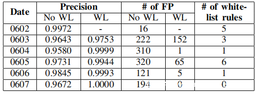 上表使用跟踪D-7的统计数据来显示ZeroWall的白名单机制的效果。在此实验中,白名单每天更新一次。白名单规则的数量指的是每天添加多少白名单规则,具体取决于当天标记的FP。例如,在手动调查0602的结果时发现了16个FP。基于这些FP,安全工程师组成了5个白名单规则并将其添加。将这5条规则应用于0603的数据,并将0603的FP减少70(222-152)。结果表明,白名单以较低的开销减少了FP的数量(规则数量非常少)。基于这些结果,认为ZeroWall在实际部署中是可行的。