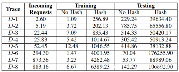 在具有以下配置的一台服务器上使用每秒处理的请求数来评估训练和检测速度:Intel(R) Xeon(R) Gold 6148 CPU 2.40GHz ∗ 2, 512GB RAM。请注意,实际上可以使用更多服务器。下表的结果表明,ZeroWall的开销很低,本文提出的哈希表机制可以将开销减少2-3个数量级。